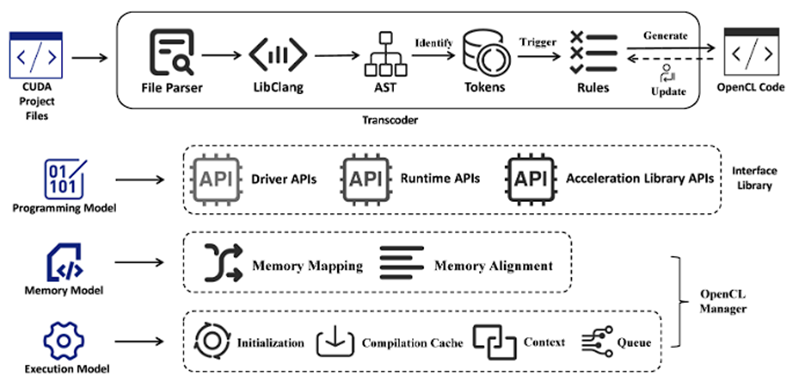 张玉志教授团队致力于打破CUDA生态壁垒、助力国产智算生态的快速发展,团队先后承担并完成了多项国家重点研发计划课题,其中,着重实现了CUDA到统一异构编程标准OpenCL的自动转换框架。该自动转换框架能够以85%-95%的自动化率完成CUDA程序到OpenCL的源码转换,提供在非英伟达硬件平台上可靠、高效的运行时支撑。针对专有的CUDA编程模型,该框架提供了通用的底层编程接口库,能够直接隐式地代替原CUDA编程接口,有效解决了代码的硬件依赖问题;对于复杂的CUDA内存模型,该框架设计了加速器内存地址映射机制,解决了原CUDA程序在非英伟达GPU芯片上无法正确寻址的问题;在源码转换方面,该框架抽象了丰富的转换规则,在支持大规模CUDA应用程序转换的同时,大幅提高了自动化水平。该框架在TensorFlow、PyTorch等超大体量的CUDA代码自动转换上得到了有效验证,并在新一代国产超算平台上实现了正确的模型训练和推理验证。该框架可应用于各种基于CUDA的计算任务程序的转换,涵盖智能制造、工业互联网等多种场景,为保障人工智能技术自主可控提供了新的思路和技术途径。