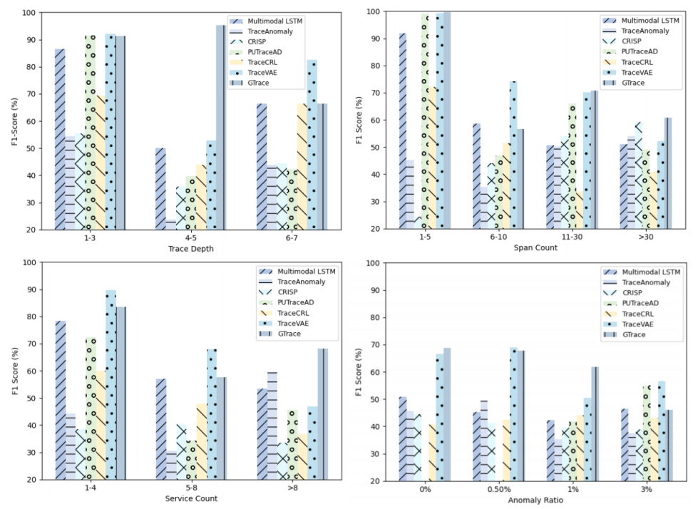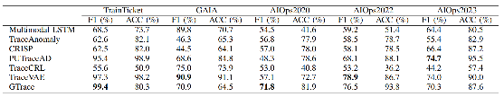 本研究在TrainTicket、GAIA、AIOps2020等五个数据集上对七个具有代表性的算法(Multimodal LSTM、TraceAnomaly、CRISP、PUTraceAD等)进行系统评估。此外,该研究还将这些数据按照不同的数据特征重新分类,以检测不同的算法在具有不同特征的数据上的具体表现。实验结果表明: