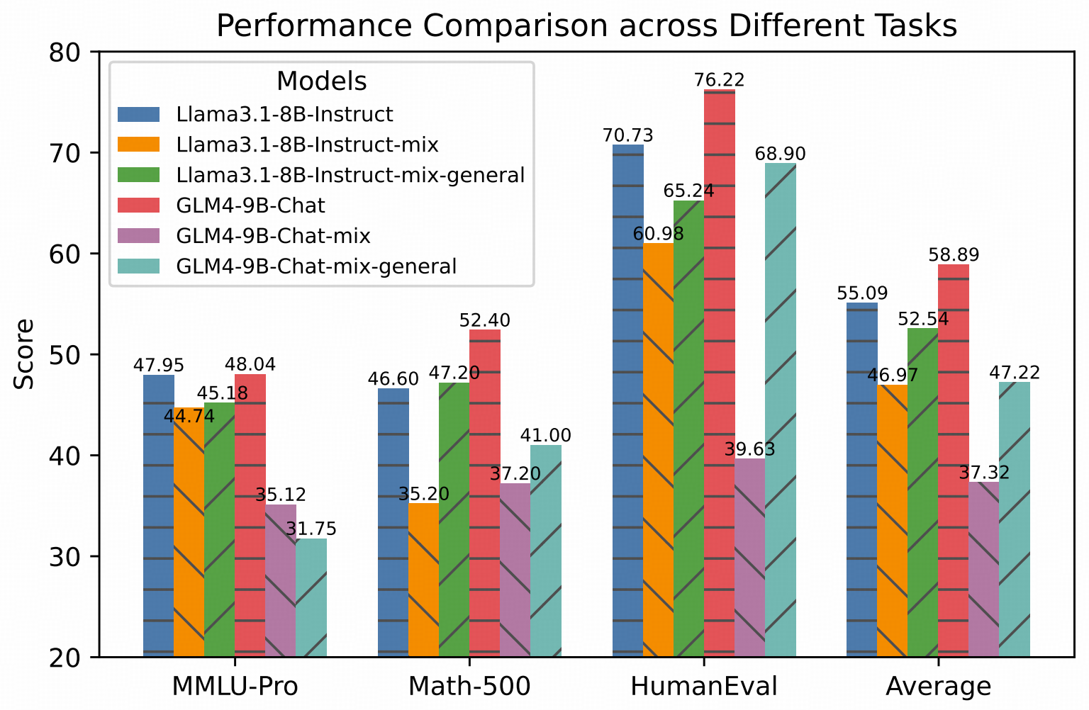 掌握游戏后是否会丢失通用能力?通过在MMLU-Pro(知识)、Math-500(数学)和HumanEval(代码)基准上的测试发现,仅使用游戏数据微调会导致模型通用能力下降。然而,通过在训练数据中混合少量的通用指令数据(如20k条通用数据配比8k条游戏数据),模型可以在保持游戏精通度的同时,有效恢复其通用能力。