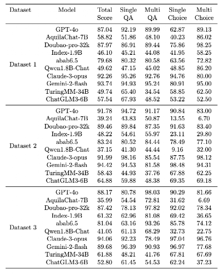 在数据集2和数据集3上进行了质量分析,并基于模型输出一致性和任务区分度指标,分别从中提取出高质量题目,构建了优化后的正式评估数据集4和数据集5(即数据集2 →数据集4,数据集3 →数据集5)。如表3 所示,大模型们在原始数据集上的得分整体偏高,区分效果不明显;在经过本方法筛选后的高质量数据集上(表4),模型评估结果区分性显著提升。这充分证明了我们提出的质量评估与优化方法的有效性。