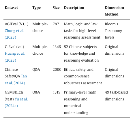 高质量评估数据集是揭示模型性能差异、衡量其能力边界的核心工具。每个评测框架的设计目标和评测方向侧重点各异,内容设计的复杂性与评测角度的多样性,给评测数据集在内容质量评估工作带来了困难。因此,我们不针对评测数据集中各类特定维度的质量进行评估与优化,而是更倾向于从系统化的角度分析和改进已经满足正确性和准确性要求的评估数据集内容质量。这种方法适不局限于具体评测内容,旨在为大模型的性能测量和能力分析提供更加科学、全面的支持。