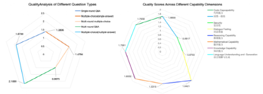 (4)质量分析Q效果实验结果 对数据集1平均质量得分Q的分析表明,不同维度和不同类型的提问质量存在显著差异(如图6所示)。数据集问题分析与其观察到的质量评分高度一致。不同问题类型的质量评分存在差异,这表明在为大型语言模型设计评估任务时,应更注重复杂的问题格式,尤其是多轮问答, 这类问题能够更全面地评估大型语言模型在复杂现实场景中的表现。