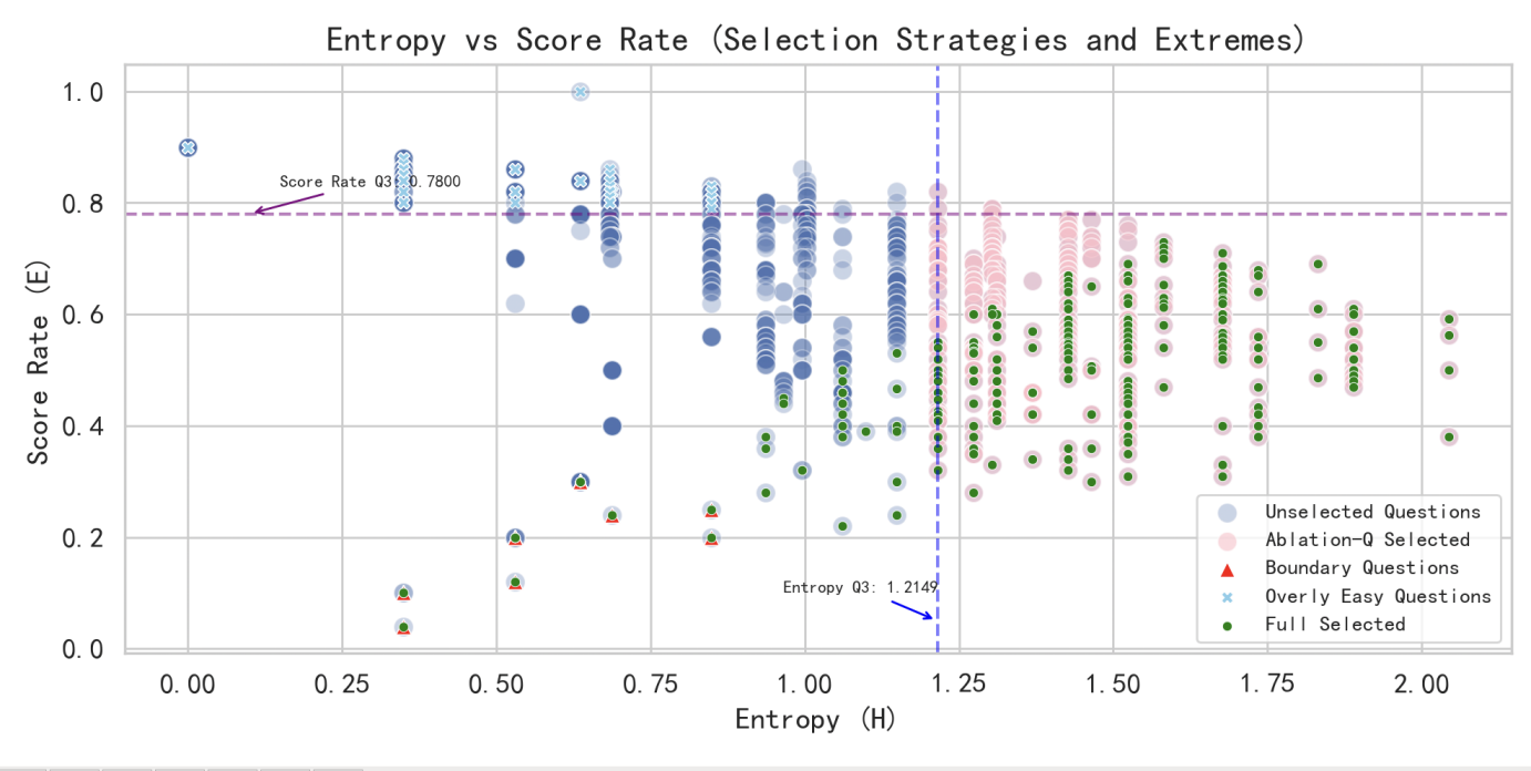 引入信息论“熵(H)”衡量模型得分分散度,结合难度校正(E),设计综合评估指标质量分数(ε为平滑项),保留“低熵但高Q”这类题恰能区分模型能力细微差距的“边界题”(见图4)。
