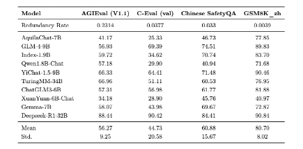 为验证所提出方法的有效性,研究团队选取了四个公开数据集进行实验,分别为 GSM8K_zh、AGIEval、C_Eval 和 Chinese_SafetyQA。这些数据集涵盖了计算推理、多项选择和安全问答等典型任务类型,用于综合评估方法的泛化能力与实际应用表现。不同大语言模型在各数据集上的得分与数据集的冗余度,如表5 所示。