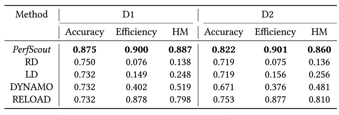 为了验证PerfScout的性能,我们在来自华为云的两个工业数据集D1和D2上进行了实验,并与随机工作负载生成方法(RD),线性工作负载生成方法(LD),DYNAMO 和RELOAD 进行对比。实验结果显示PerfScout在D1和D2上的调和平均值(HM)均超过0.86,表现最佳。与使用固定并发时长的三种基准方法(RD、LD和DYNAMO)相比,PerfScout的HM至少高出0.368;与同样使用强化学习的RELOAD相比,PerfScout的HM至少高出0.05。这表明PerfScout在性能拐点识别的准确度和性能测试效率方面都具有显著的优势。