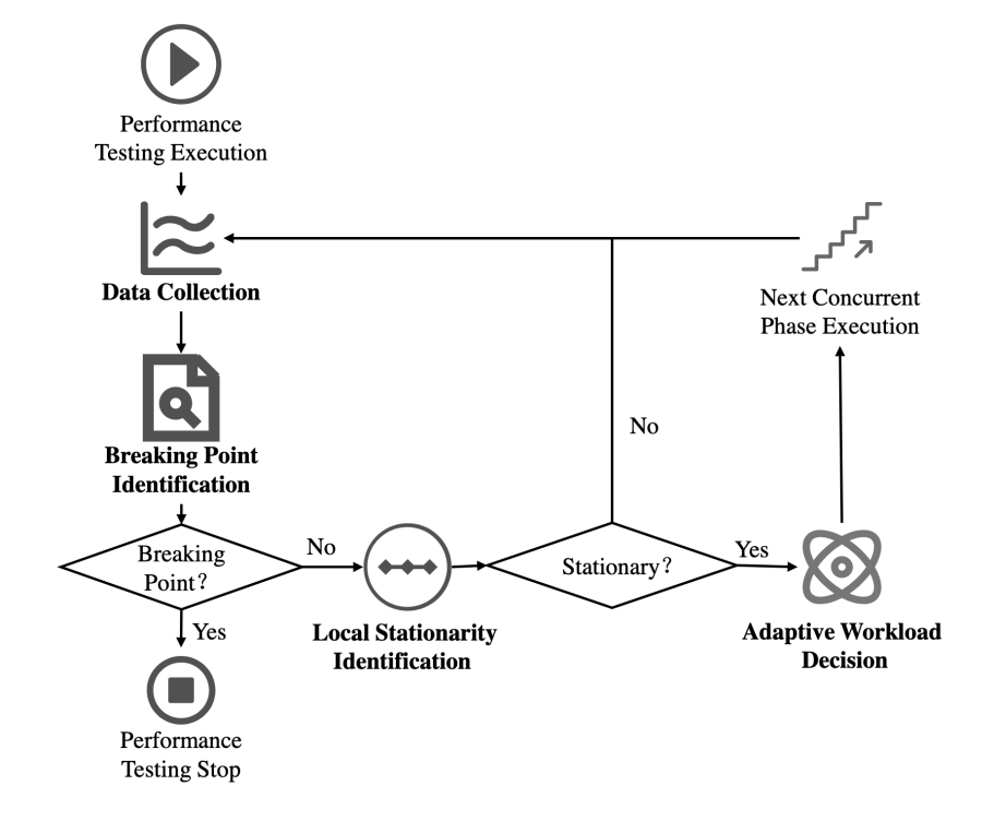 3.局部稳态识别:若被测系统尚未到达性能极限,PerfScout会使用 ADF与 KPSS两种互补的统计检验方法来判断系统在当前负载下是否到达稳态。只有确认平稳后才会继续提升负载,有效降低了KPI短时抖动的干扰。
