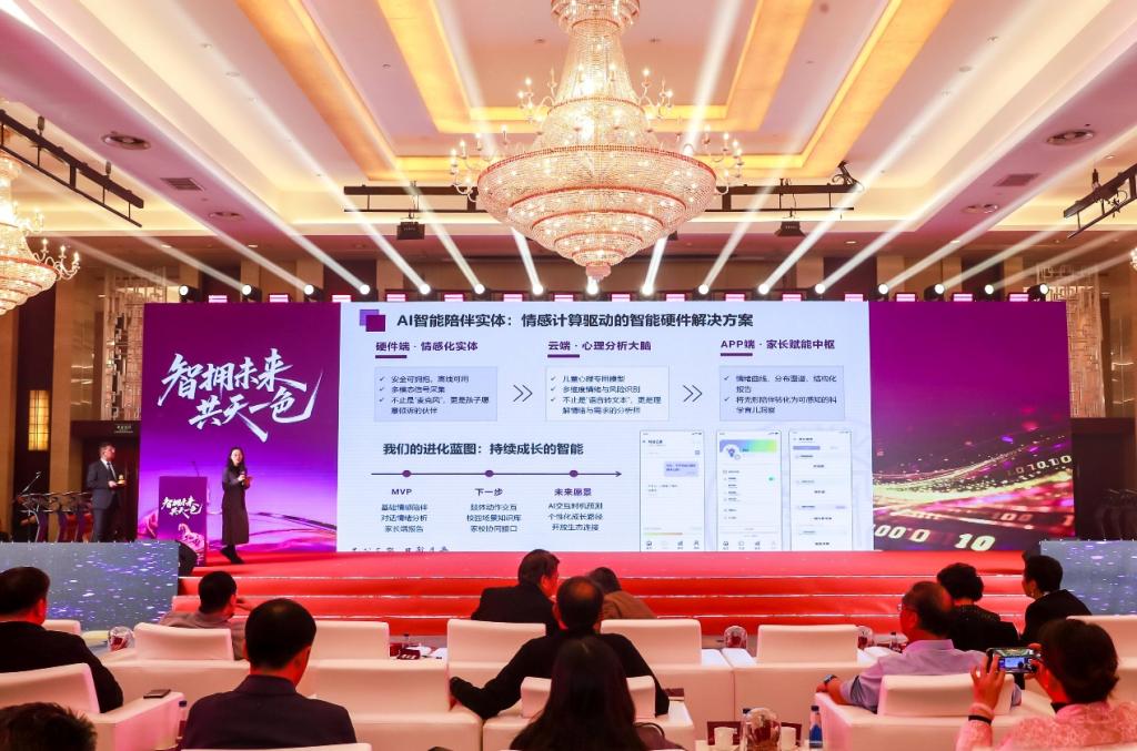 的南开-天一联合实验室发布了两项研究成果。AI+建筑展厅展示了AI+设计、AI+施工、AI+运营等智能体,为建筑行业数智化转型提供了软件平台。AI+教育产品展示了智慧教育解决方案,包括AI家庭教育、AI智能陪伴和AI启发式教学三个智能体。