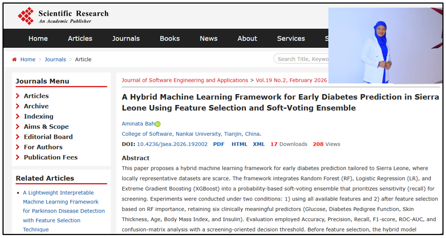 (通讯员 楚义芳)近日,美国科研出版社旗下的《软件工程与应用》学术期刊(Journal of Software Engineering and ApplicationsVol.19 No.2, February 2026,Scientific Research Publishing Inc.),在2026年第2期,发表了2024级商务部援外班塞拉利昂留学生阿米纳塔(Aminata Bah)的学术论文《塞拉利昂早期糖尿病预测的混合机器学习模型》(Hybrid Machine Learning Model for Early Diabetes Prediction in Sierra Leone),该论文实际是阿米纳塔正在撰写的硕士学位论文的研究摘要。