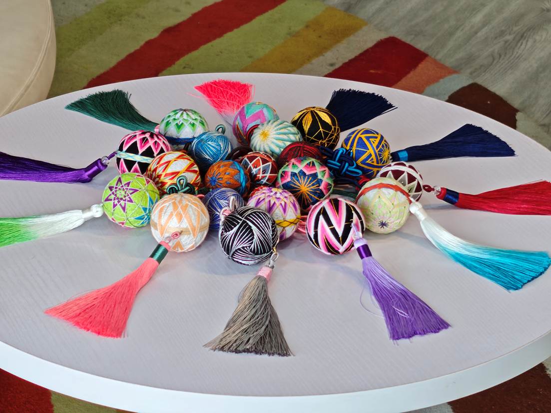 拍摄的第二日,团队成员们聚集在在非遗角,见到了赵家湾村的第二件宝物——手鞠球。非遗传承人一手握棉布,一手抓起一把薰衣草和稻壳混合而成的内料,随着她的动作,逐渐成形的内芯散发出阵阵清香。“缠线是最关键的步骤,这决定了做出来的成品圆不圆,绣出来的形状对不对称,”她强调到,“这线也不能缠的太有规律,越乱缠出来越好看。”彩色的丝线在她指尖流转,小球逐渐成形。最后一步便是绣花,“想让这花纹绣出来好看,就要定好每一个点。”她拿起软尺,量出球的周长,算出每两点之间的距离,并用定位针做好了标记,然后按照点连成线,最后成了精美的花纹。缅甸来的援外留学生Han Nway Nyein对此赞叹道:“这实在是太神奇了,这么简单的材料竟然能做出如此精美的工艺品,它让我深刻体会到了中华文化的魅力。”一分一秒,一针一线,时间的流转在逐渐浮现于小球的花纹上有了真实的展现,也在非遗传承人熟练的针法上有了深刻的体现。